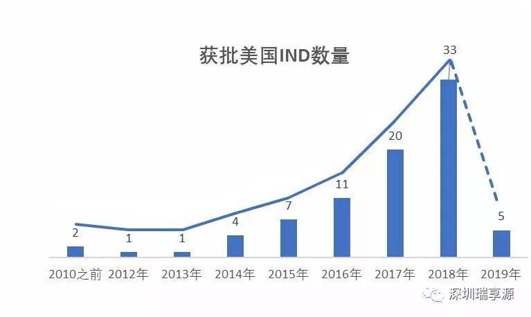 从产品的美国IND获批时间看,2014年是中美双报数量激增的启动点,从图5中可以看出,2014~2018年折线的斜率愈发陡峭,表明近几年中美双报产品的数量和增幅都在不断扩大。