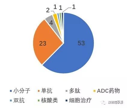 通过关键词检索,共收集到50家公司的84个品种参与中美双报,其中上市公司19家(包括A股、港股以及在国外市场上市的公司,不包括新三板上市公司),非上市公司31家(包括新三板上市公司)。84个品种中有小分子化药53个、单抗23个、其他多肽3个,还出现了双抗、ADC、小核酸和细胞治疗等前沿产品。