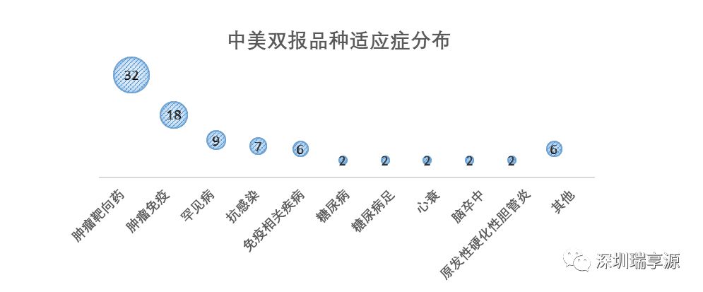 从产品的适应症分布看,肿瘤适应症占比超过60%,84个产品有50个与肿瘤治疗相关。图6将肿瘤药物分为一般靶向药物和肿瘤免疫产品分别计数,可以看到在中美双报的肿瘤治疗药物中,靶向药占比相对较大,同时靶向药物针对的靶点比较丰富,不同企业之间较少重复开发。而肿瘤免疫方面产品同质化比较严重,18个产品中有11 个都与PD-1/PD-L1有关。这也可能受到肿瘤免疫已知靶点数量较少的影响。