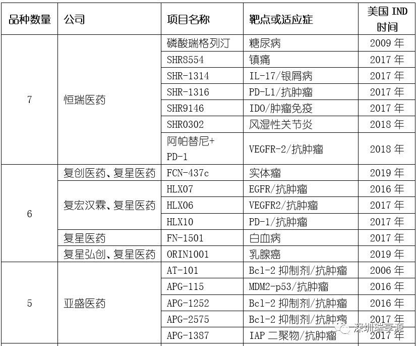 恒瑞医药有7个产品同时在中美两地开展临床试验,是拥有中美双报品种数量最多的公司;紧随其后的是复星医药,有6个品种中美双报;亚盛医药的表现非常抢眼,是非上市公司中的领头羊,5个产品同时获得中美两国临床批准。(详细公司及获批产品数量见文末附表1)