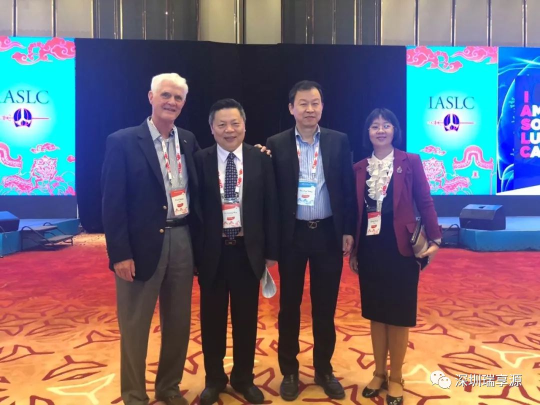 亚盛医药董事长杨大俊博士(右二)与国际著名肺癌专家、亚盛医药临床顾问委员会顾问Paul Bunn教授(左一),中国胸部肿瘤研究协作组主席吴一龙教授(左二),广东肺癌研究所副所长周清(右一)在会场