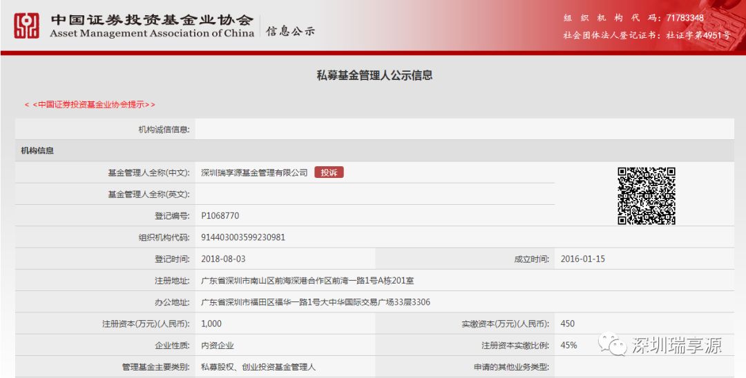 2018年8月03日,从中国证券投资基金业协会获悉,深圳瑞享源基金管理有限公司完成登记,正式成为中国证券投资基金业协会备案的合格私募股权、创业投资基金管理人,获准开展私募股权类基金业务,并接受中国证监会及基金业协会的监管。