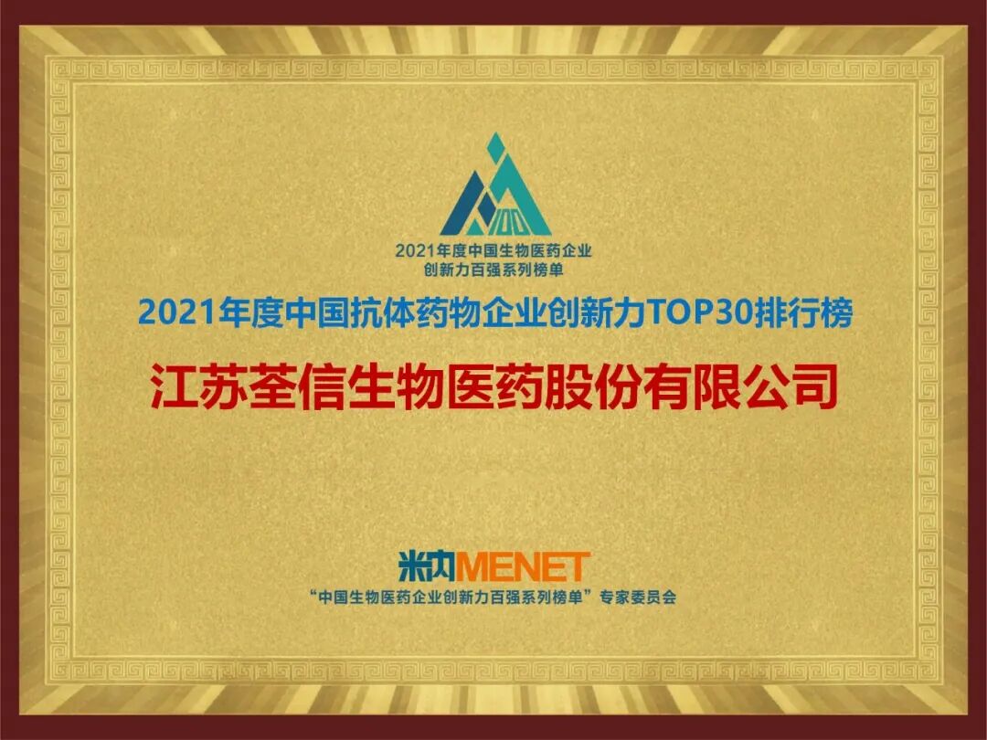 此番连续获得业内认可,将激励荃信生物进一步践行创新发展理念,担负医药人的使命与责任,不断寻求创新突破,为临床和病患提供更多、更好的抗体药。