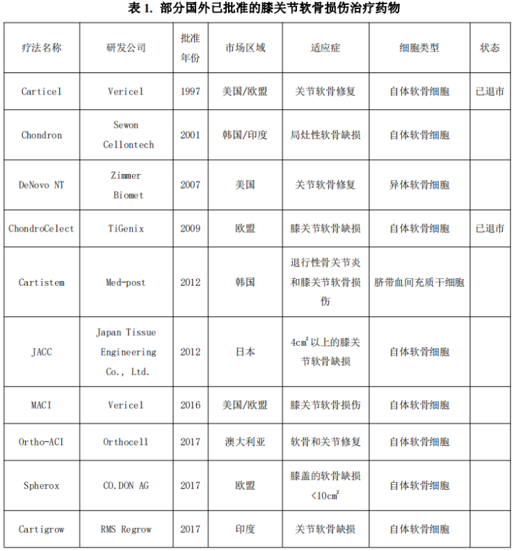 目前全球范围那已获得批准的治疗膝关节软骨损伤的药物中大部分药物为自体软骨细胞,即ACI/MACI。