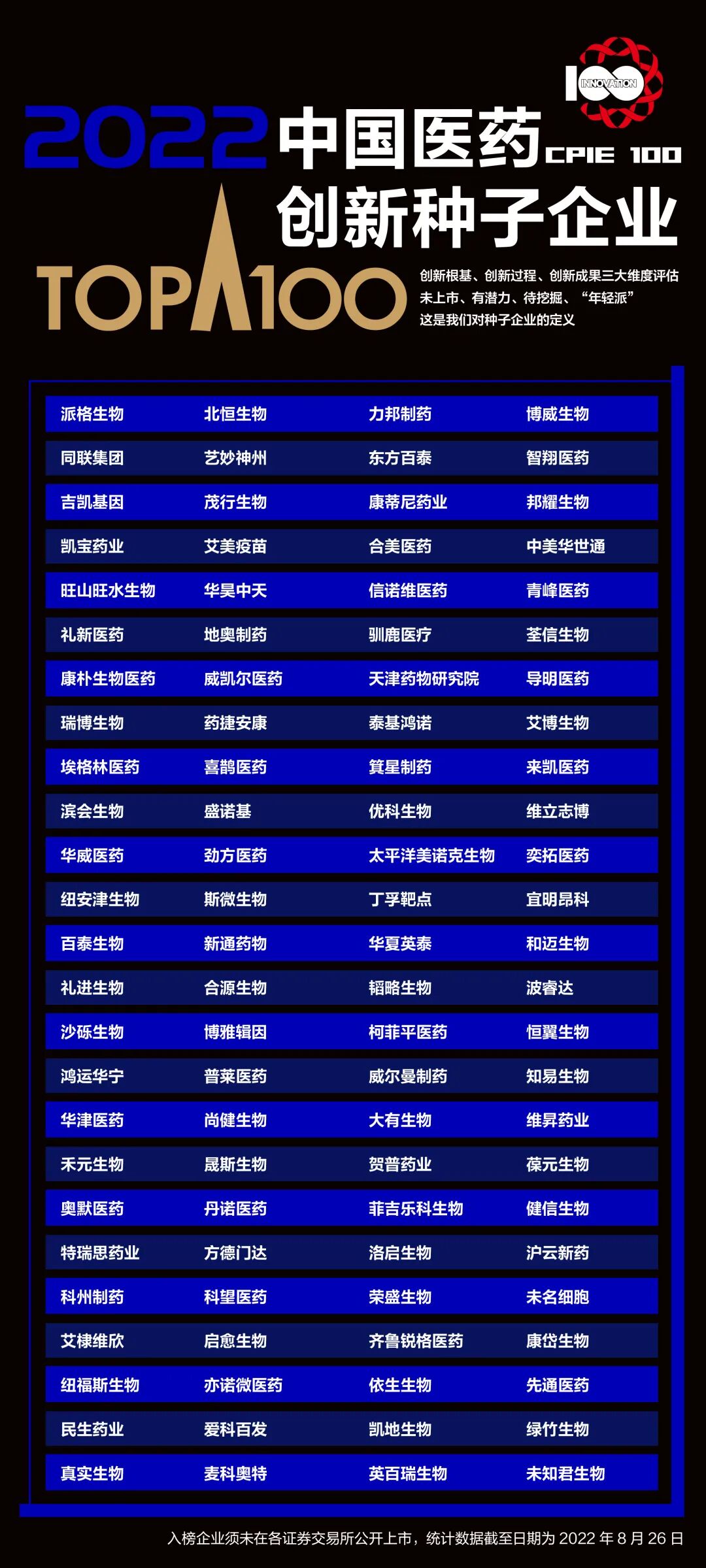 2022年11月2日~4日由中国医药企业管理协会、中国医药生物技术协会、中国农工民主党中央委员会办公厅主办、杭州市投资促进局主办的2022中国医药企业家科学家投资家大会(简称“启思会”)将在杭州举行。会上将隆重发布“2022中国医药创新种子企业100强”榜单,并对入榜企业进行颁奖。