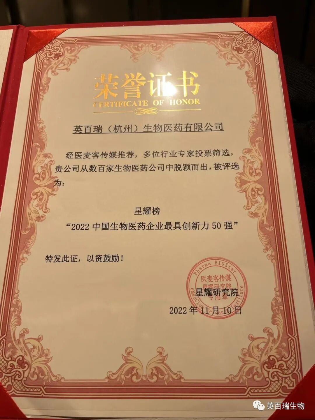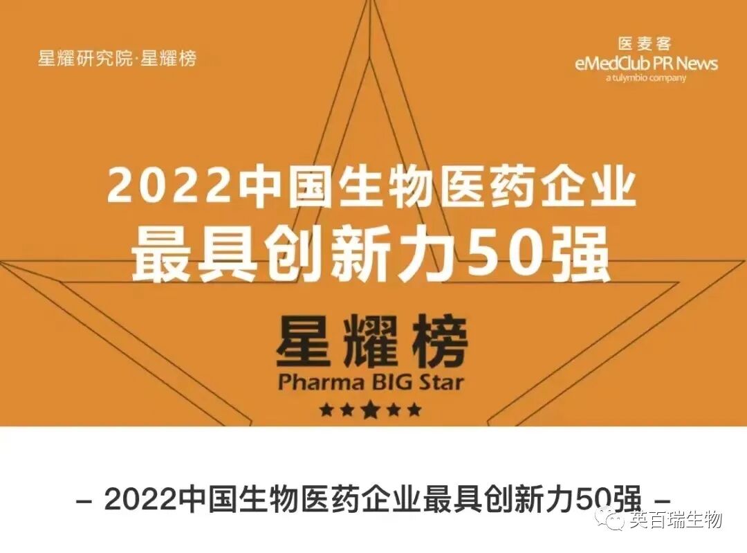 面对全球生物医药高速发展的趋势,中国生物医药企业不仅迅速适应全球创新发展的浪潮,还能引领创新发展的方向。唯有创新,才能在发展中永不败落;唯有创新,才能在时代变化中保持领先。医麦客星耀研究院推出“【星耀榜】2022中国生物医药企业最具创新力50强”评选活动。2022年11月10日,在2022上海(闵行)生物医药产业创新峰会颁奖典礼上,由“医麦客-星耀研究院”联合行业专家评选的2022星耀榜正式揭晓,英百瑞荣登该榜,获评2022中国生物医药最具创新力50强企业。