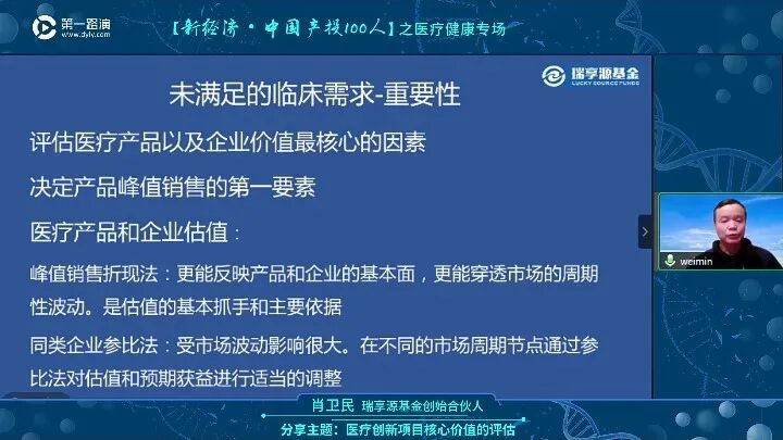 3月24日,在第一路演举办的“新经济·中国产投100人”专题系列直播公开课中,瑞享源基金创始合伙人肖卫民博士亲临分享医疗创新项目核心价值的评估,同时带来生物医疗领域的多年投资心得。