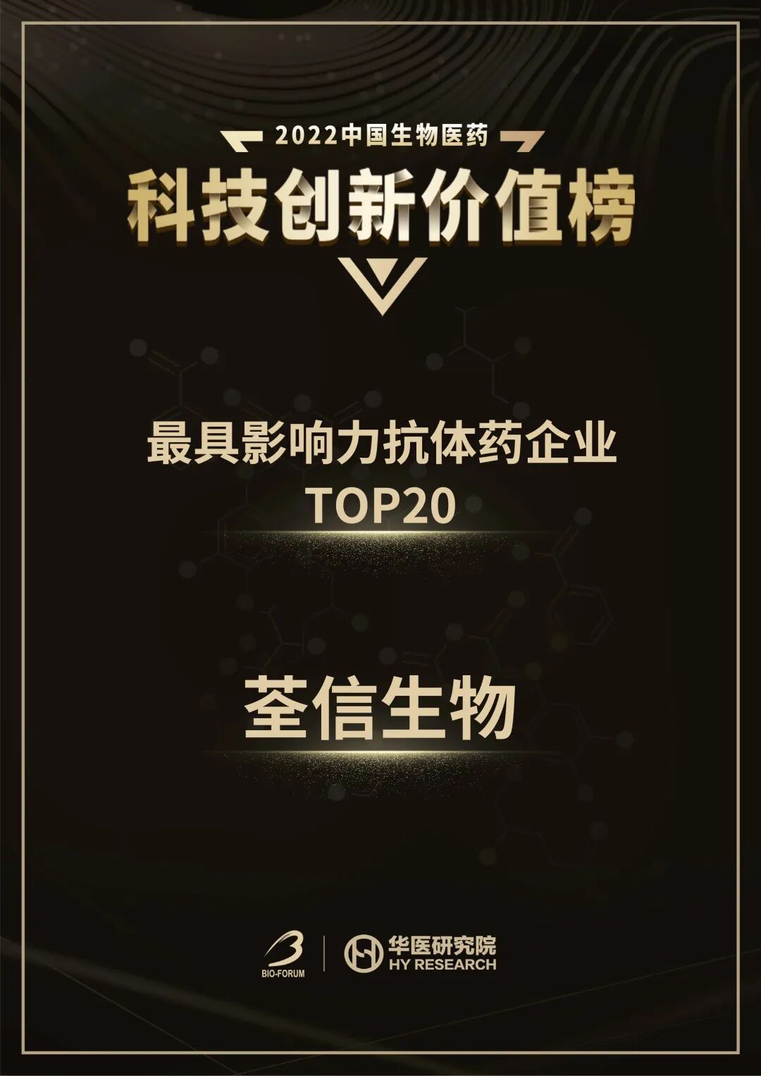 11月10日,第24届上海国际生物技术与医药研讨会(BIO-FORUM)系列活动(中国生物技术与医药创新论坛暨2022中国生物医药科技创新价值榜颁奖盛典)于上海召开。荃信生物荣登2022中国生物医药科技创新价值榜“最具影响力抗体药企业TOP20”榜单。